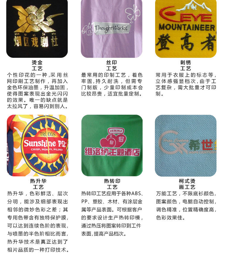 logo工艺:丝印/绣花/热转印/柯式烫画