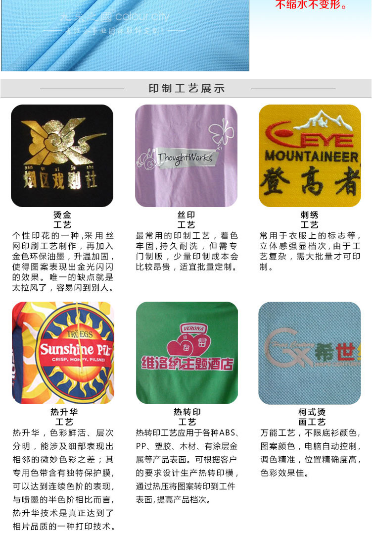 logo工艺:丝印/绣花/热转印/柯式烫画
