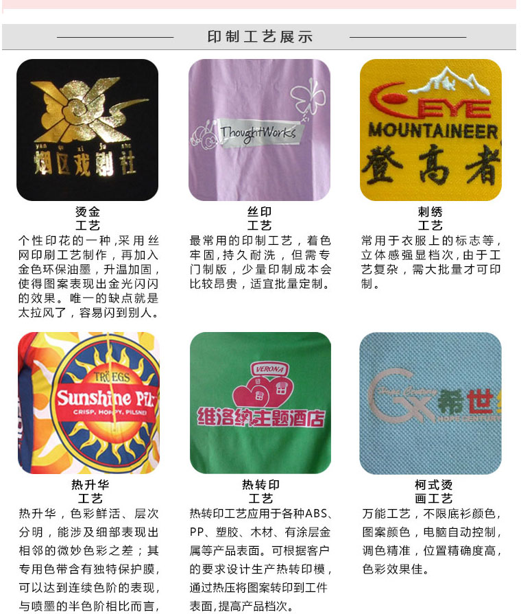 logo工艺:丝印/绣花/热转印/柯式烫画
