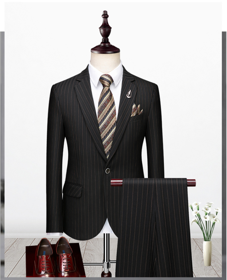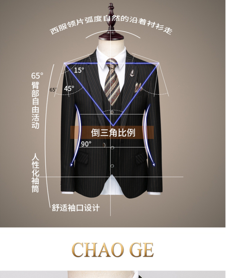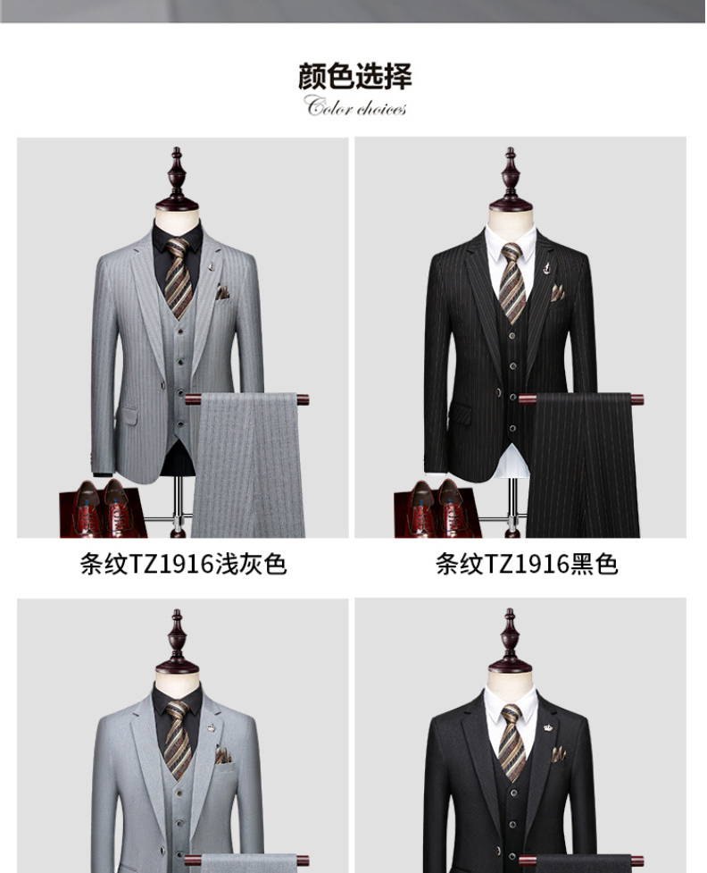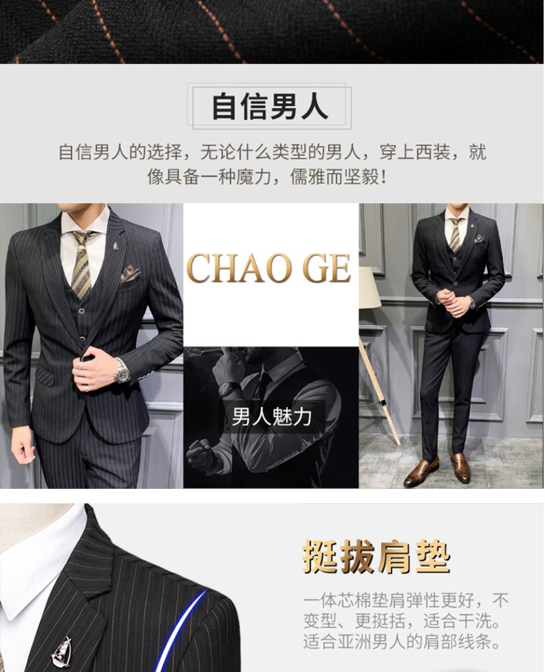 男士条纹西装三件套韩版修身商务定制礼服西服套装婚礼工作伴郎服