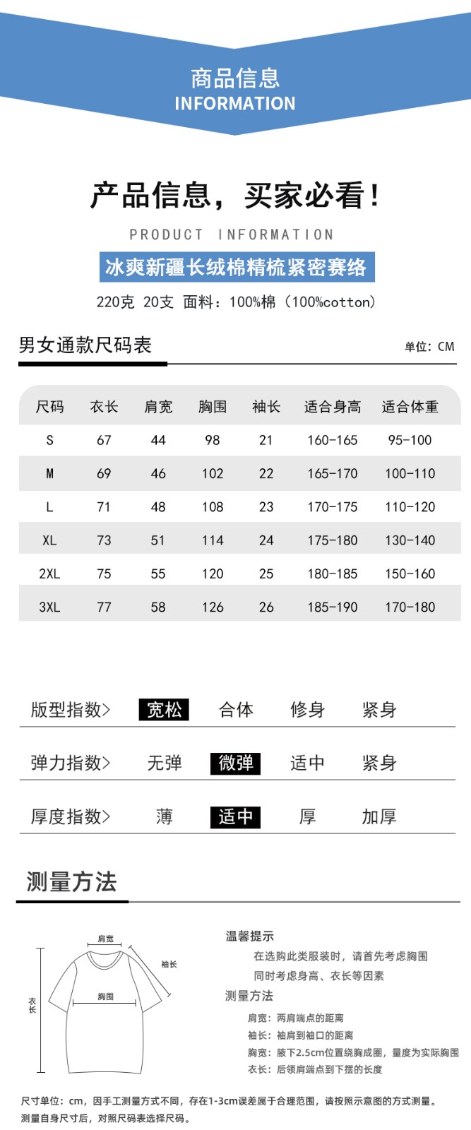 220克20支冰爽新疆长绒棉日系风精梳紧密赛络纯棉宽松版T恤